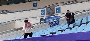 場館內(nèi),比賽場地已就位,草坪已經(jīng)鋪設(shè)修整好,據(jù)介紹,草坪可以滿足中超等級別的賽事,并且現(xiàn)在每天都會養(yǎng)護(hù)施肥、早晚澆水,讓草長得更好。在觀眾席,工作人員正在做進(jìn)一步的清掃,地面掃過一遍之后再拖一遍;6萬多個(gè)座椅也已經(jīng)擦了一遍,一直到賽前都會進(jìn)行保潔。