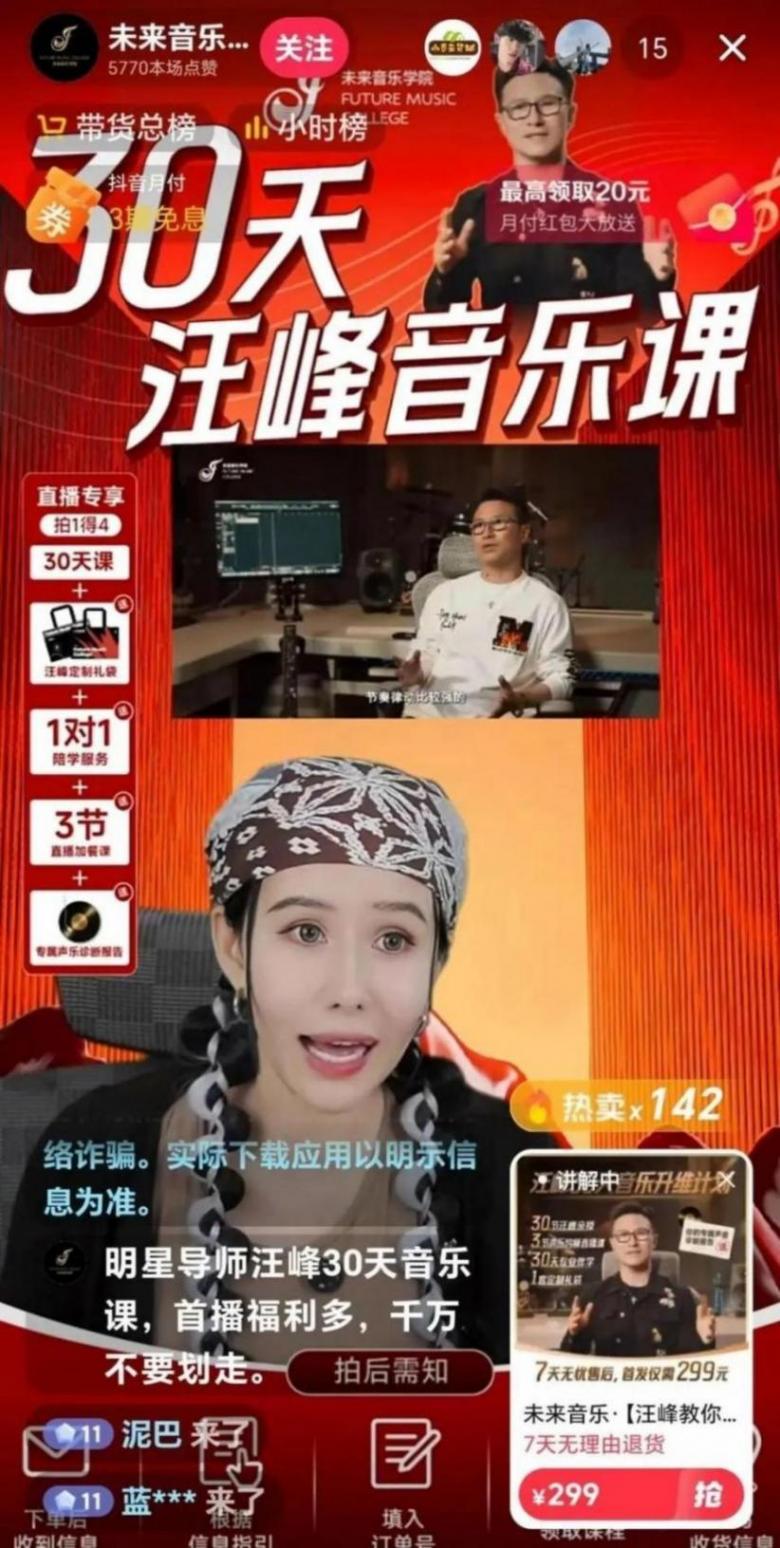 “未來音樂學(xué)院”的工作人員在直播中介紹,這份音樂課程是汪峰帶領(lǐng)團(tuán)隊(duì)研發(fā)的,適合零基礎(chǔ)的小白學(xué)習(xí)。30天的學(xué)習(xí)完成后,還會(huì)組織相關(guān)考核,特別優(yōu)秀者可以進(jìn)階學(xué)習(xí),之后有機(jī)會(huì)參與汪峰的線下活動(dòng),甚至成為汪峰演唱會(huì)的伴唱嘉賓。該工作人員還提到,如果對(duì)課程不滿意,支持七天無理由退貨。