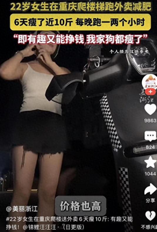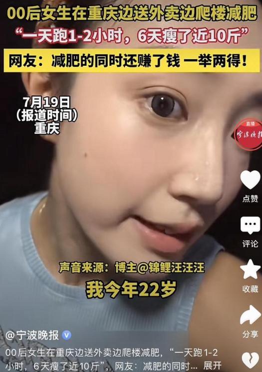 重慶這個(gè)22歲小姑娘也是夠拼的,胖了之后各種減肥方法都試過了,什么節(jié)食啊跑步機(jī)啊,都沒用,最后居然想到去送外賣,你說她腦回路是不是跟別人不一樣,我反正是想不到的。她還有個(gè)特別的癖好,專門接那些破舊小區(qū)的單子,越是沒電梯的越要接,一趟下來十幾層樓梯,累死個(gè)人。