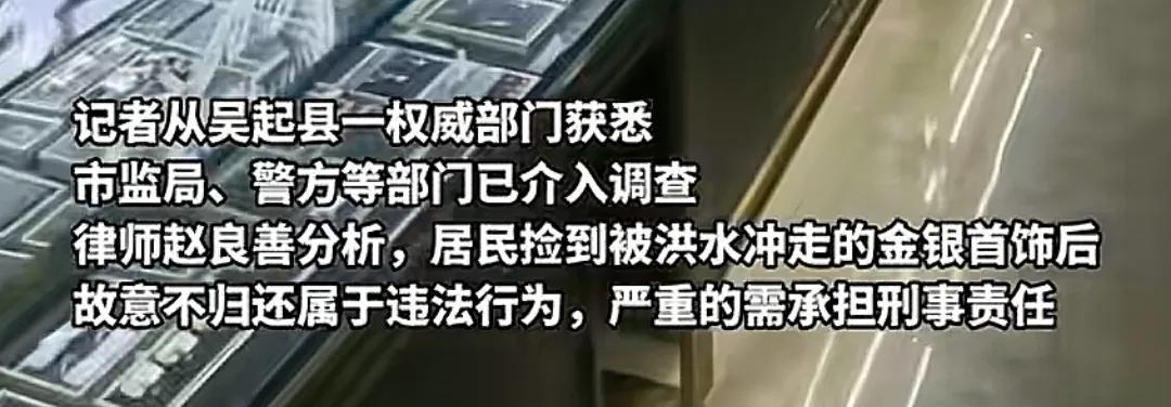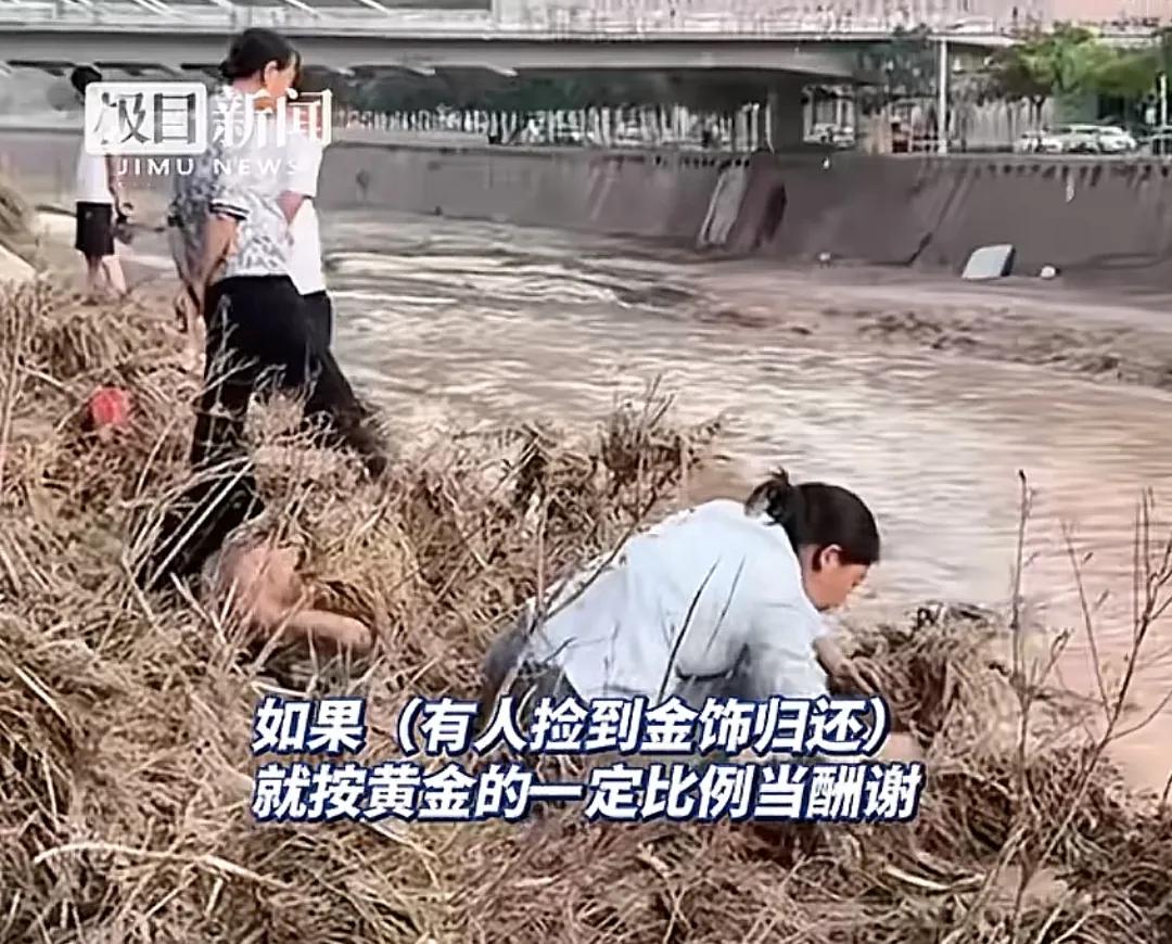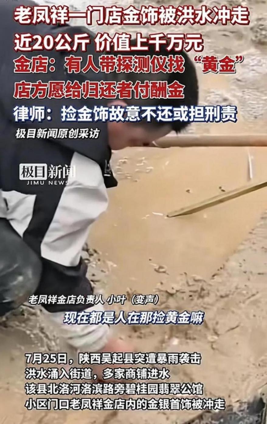 有工作人員表示,店里近20公斤的黃金首飾都被沖走了,價值上千萬,洪水退去,有人帶著探測儀在找黃金。