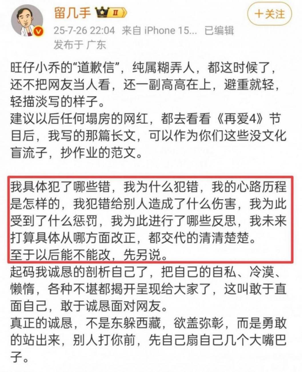 是可忍留幾手忍不了,就在旺仔小喬道歉聲明發出后不久,留幾手辛辣點評其道歉聲明是純屬糊弄、拿網友不當人、避重就輕。