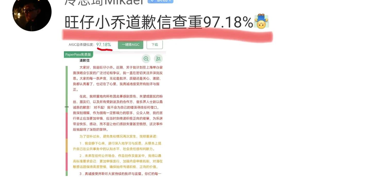 更讓人詫異的是,有網友拿著這則道歉聲明去做原創檢測,發現重復度高達97.18%,難不成都是復制過來的?想想都想笑。
