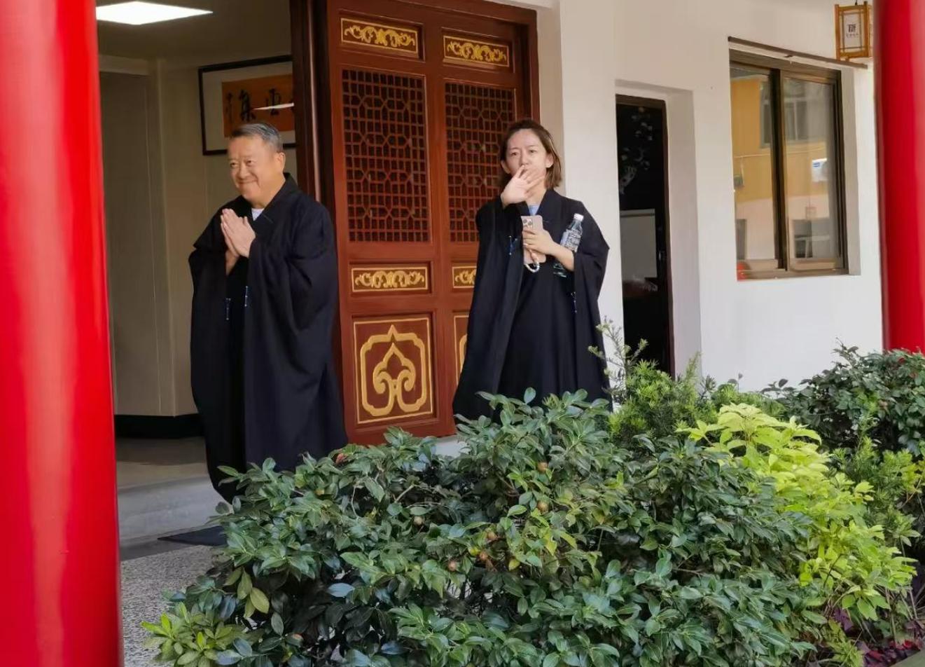能夠看到他穿著黑色僧服,看上去一臉虔誠,身后還跟著一名年輕女子,與他穿著同款式的衣服。可能到寺廟做義工的人,都會配上這樣的服飾吧。