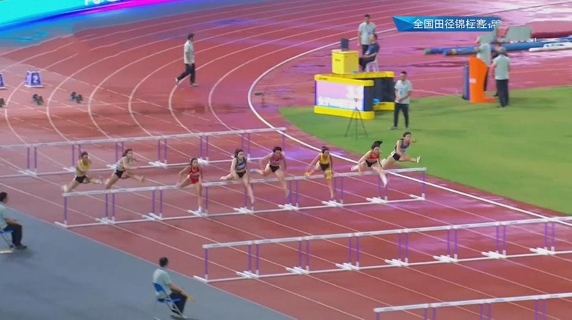 結果中途加速階段,第5道的劉景陽突然摔倒,但是并未影響到吳艷妮,她反而越跑越快,林雨薇壓力山大,奮力追趕,在攻下最后一個欄之后由于重心不穩,在撞線時也摔倒在地。