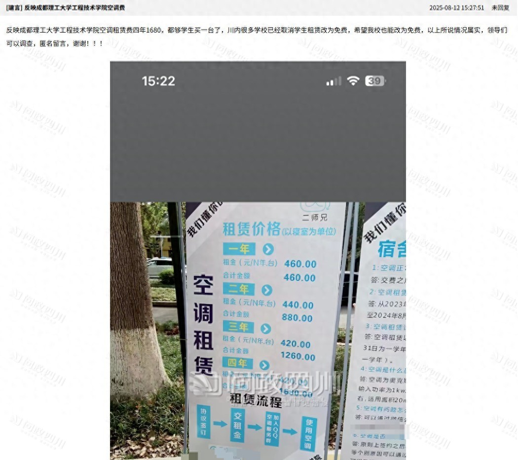 記者在“問政四川”平臺了解到,除了該校,當地多所高校如四川農業大學、成都工業學院等也被反映收取宿舍空調租賃費,網友表示空調電費也是自己出,希望能不再收取并退還已收取的費用。