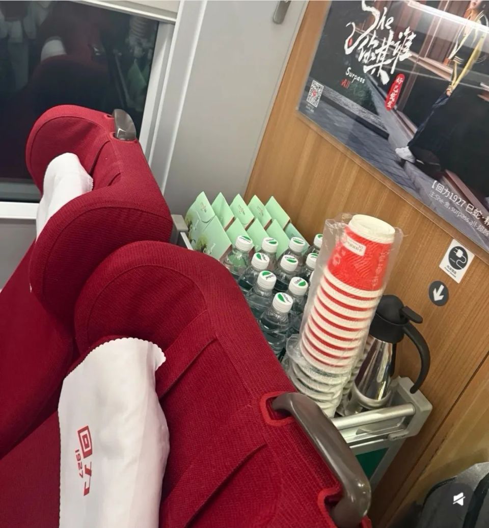 據該網友描述,她購買的車票班次為G1640(廈門北-上海南),座位位于04車廂,號數為14D與14F。乘車過程中,乘務員不斷從該座位后方推拉售貨車,搬放礦泉水時還多次發出較大聲響。“推車使用頻率極高,乘務員一直在后面搬東西、整理物品,根本沒法安靜休息。”