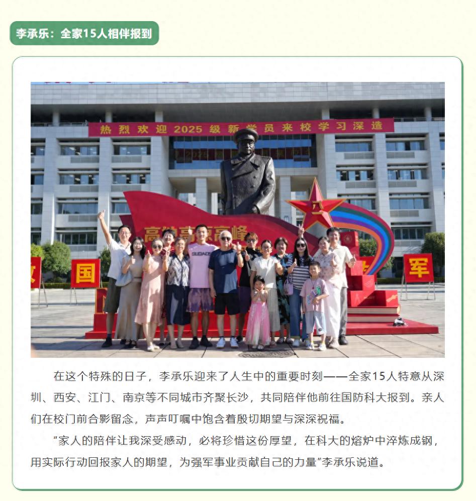 “家人的陪伴讓我深受感動,必將珍惜這份厚望,在科大的熔爐中淬煉成鋼,用實際行動回報家人的期望,為強軍事業貢獻自己的力量。”李承樂說道。