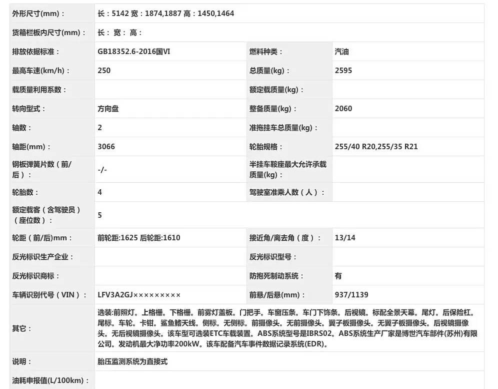 車側線條上,新車采用全新樣式的隱藏式車門把手以及簡潔的車側腰線,提升車輛的高級感。尺寸上,該車長寬高分別為5142/1874(1887)/1450(1464)mm,軸距為3066mm,相比現款在售車型5050/1886/1475mm,軸距3024mm,長寬分別增加了92mm和1mm,車高減少了11mm,軸距增加了42mm。