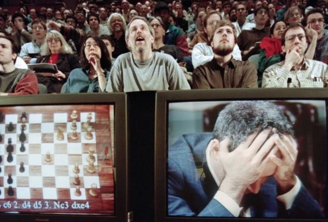 1997年,在國際象棋的棋盤上,IBM的「深藍」計算機戰勝了人類世界冠軍卡斯帕羅夫。