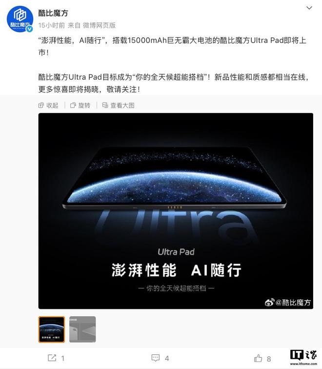 10 月 17 日消息,酷比魔方現(xiàn)已預(yù)熱一款 Ultra Pad 平板電腦,該機(jī)搭載 15000 毫安時(shí)電池,主打全天候續(xù)航,將于近期發(fā)布。