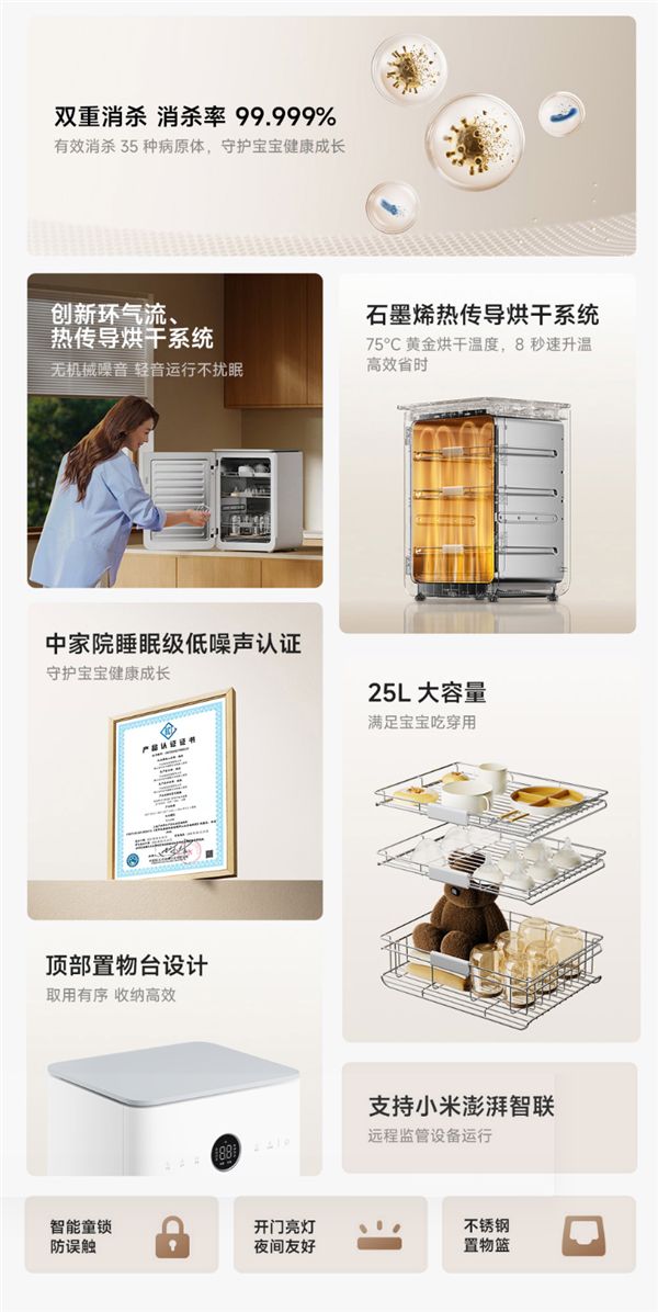 支持小米澎湃智聯與米家App控制,可遠程預約消毒、實時查看運行狀態(如工作時長、溫度),還能自定義消毒程序。