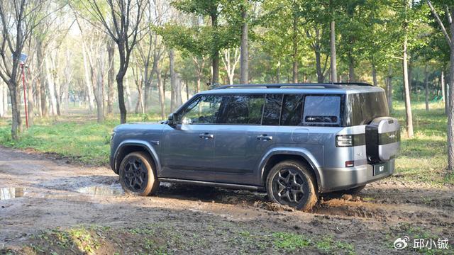 在泥濘路段,深藍G318憑借240mm離地間隙和27°接近角全程未觸底,泥漿僅附著至輪眉下沿;鈦7的離地間隙為210mm,接近角24°也略小于深藍G318,這就導致了前保險杠底部多次與泥面接觸。關鍵脫困場景中,深藍G318的雙差速鎖系統(中央無級差速鎖+磁吸式機械差速鎖)在右后輪陷入泥坑時,極速鎖止差速器,將扭矩100%傳遞至左前輪,讓車輛穩定速度脫困;鈦7因無差速鎖,右后輪持續空轉導致動力流失,通過時長較深藍G318多一些。