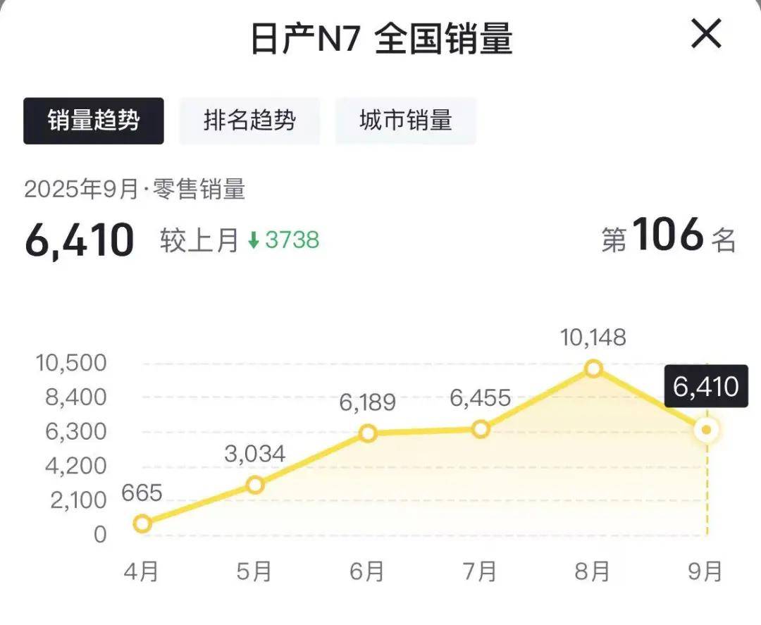 日產N7也頂不住了,9月銷量6410輛,環比下滑36.8%