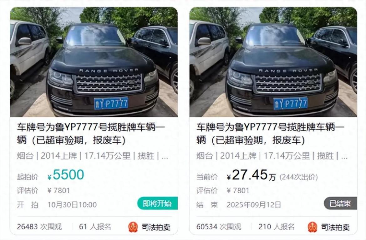 車牌7777報廢路虎5500元起拍,不含車牌號,曾以27萬余元成交后遭悔拍