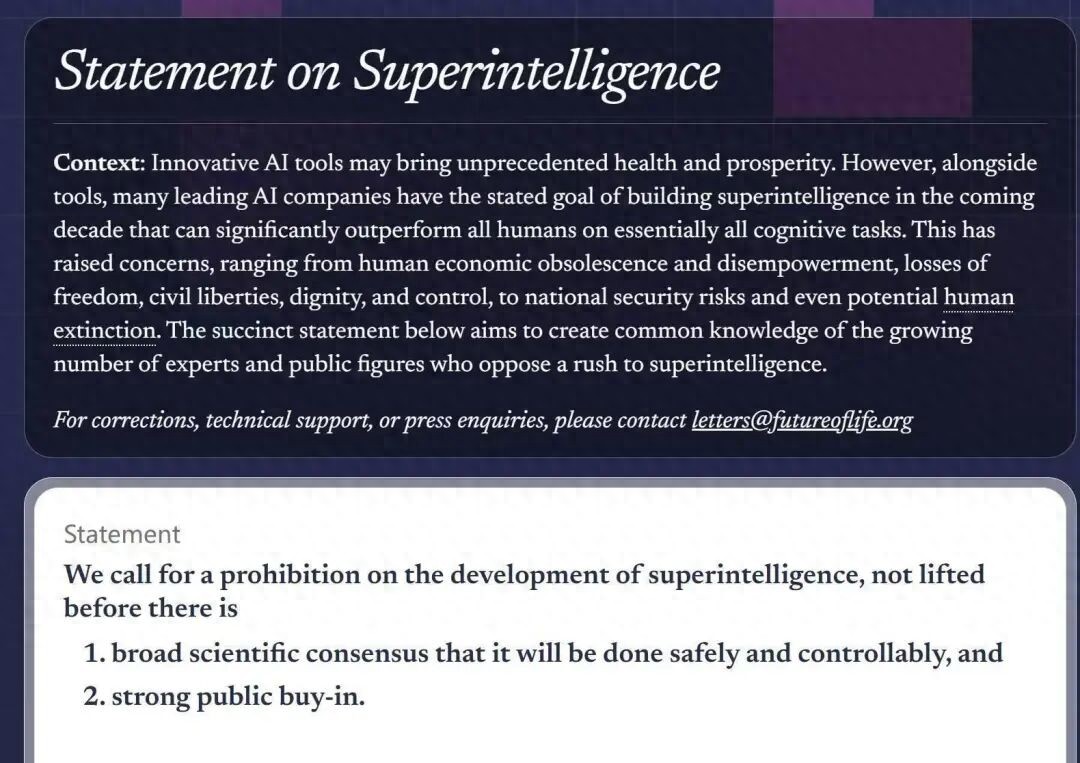 10月22日,未來生命研究所(Future of Life Institute,FLI)宣布,包括AI教父杰弗里·辛頓在內的超800名科技領袖及公眾人物,日前共同簽署發布一份倡議,呼吁在“超級智能”技術被科學界普遍認定為可控、安全,并獲得公眾廣泛支持之前,暫停其進一步發展。