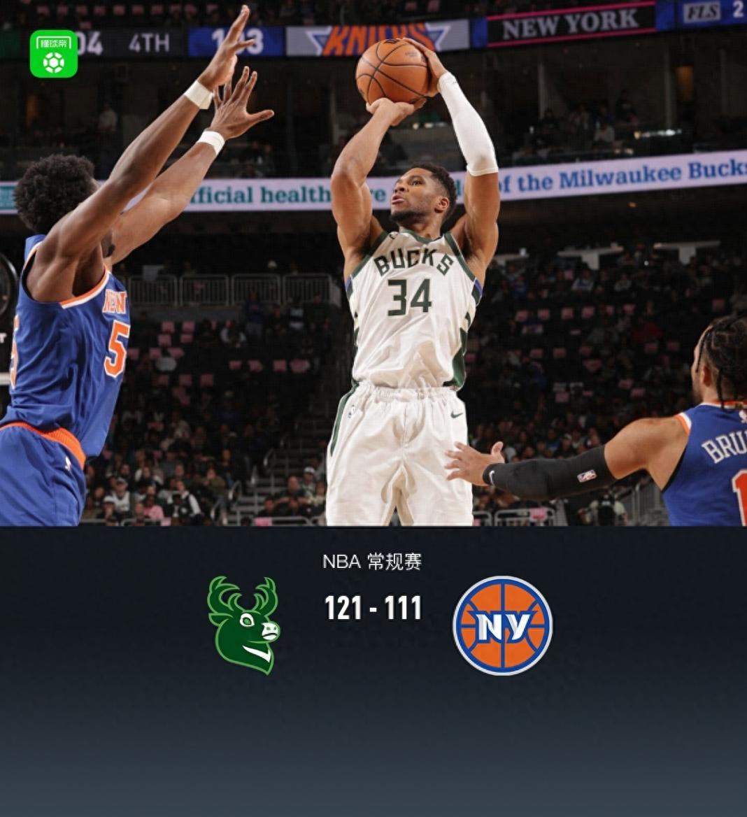 第四節雄鹿字母哥拿下11分,尼克斯米卡爾-布里奇斯拿下10分,最終雄鹿121-111戰勝尼克斯