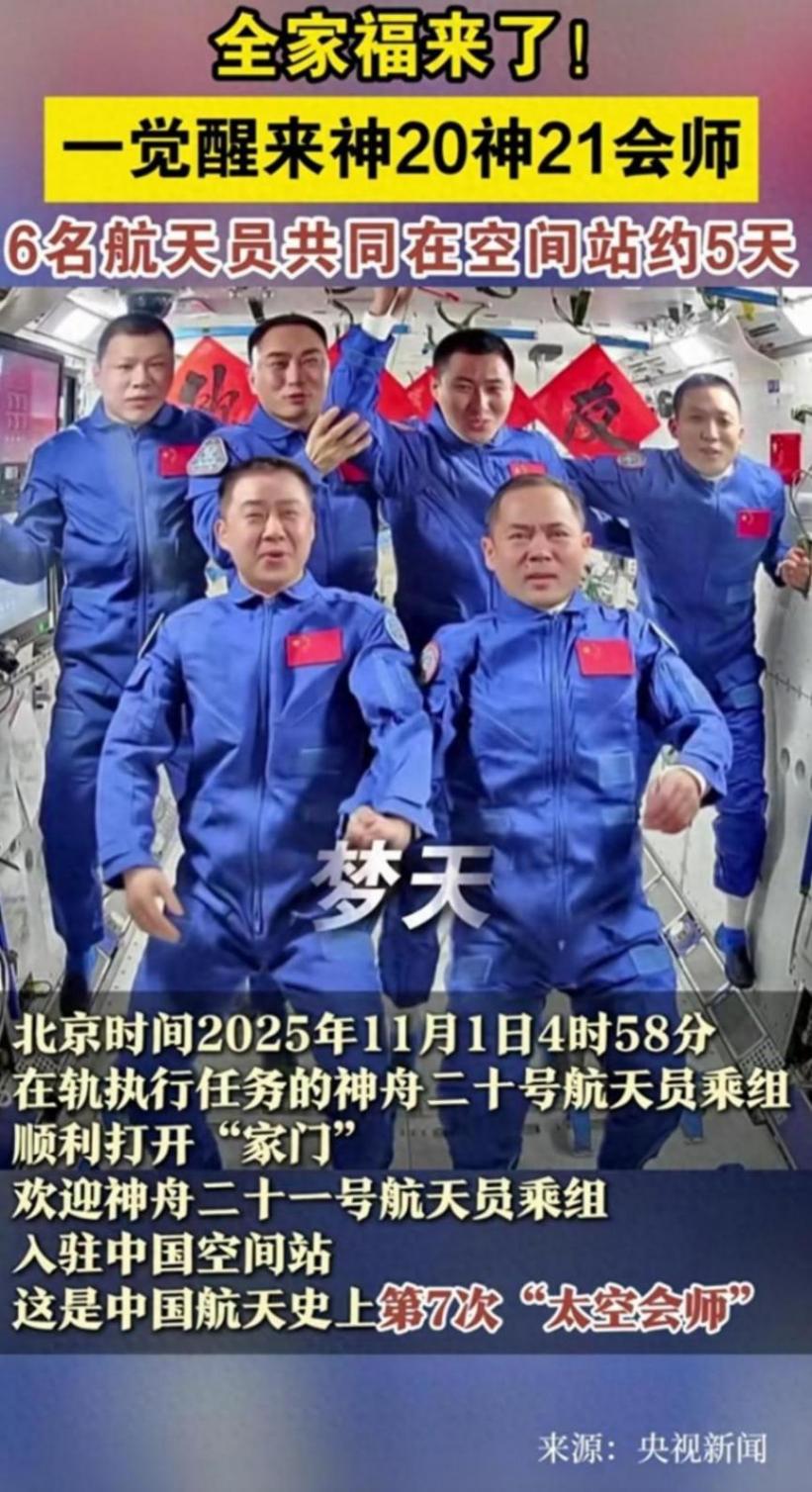 家人們,一覺醒來咱中國航天又整大活了!2025年11月1日4時58分,咱神舟二十號和神舟二十一號的航天員們在空間站來了個“太空會師”,6個人湊一塊拍了張全家福,這畫面熱鬧得跟過年似的!