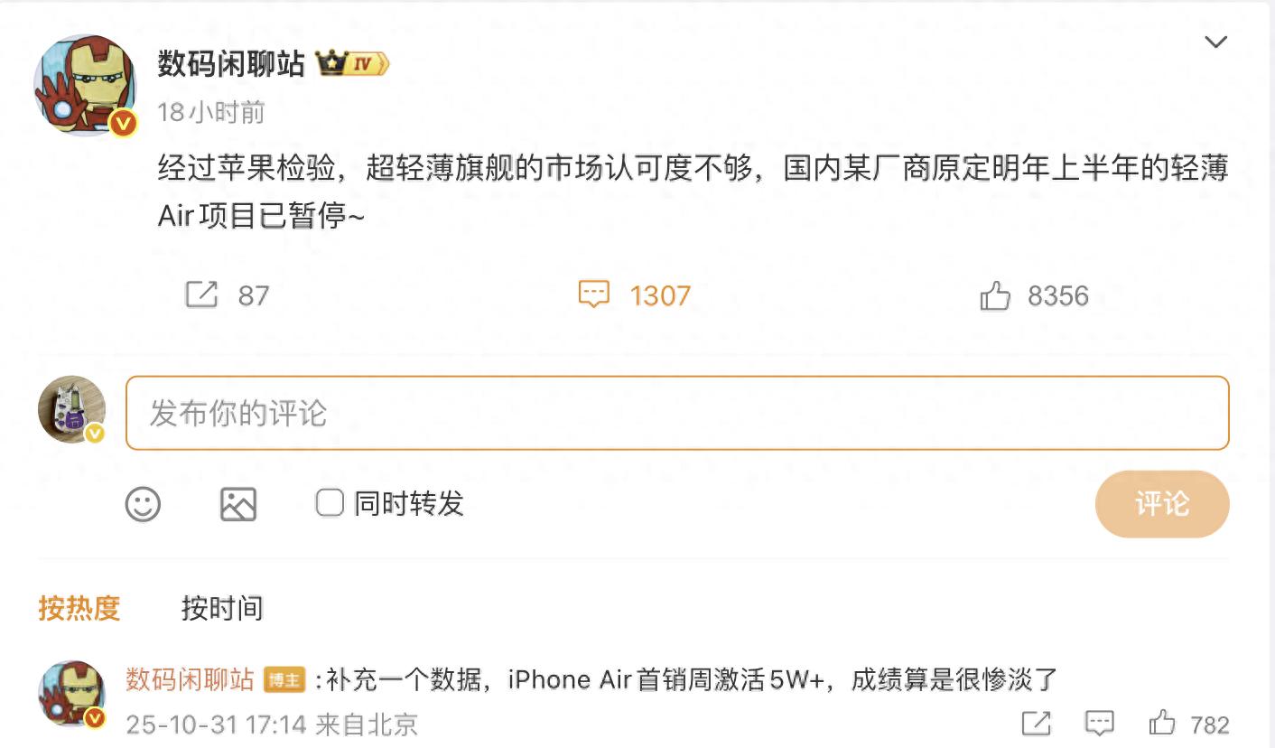 根據站哥的爆料,因為iPhone Air銷量慘淡,國內某廠商原定明年上半年的輕薄Air項目已暫停,看來國內市場對超輕薄旗艦的認可度還不夠。比較遺憾的是,目前暫未看到全球市場的數據和反應,所以iPhone Air是不是失敗的產品,暫時還沒辦法下定論。iPhone16e就是最好的證明,雖然在國內銷量很慘淡,但是海外市場表現還不錯,iPhone17e有望在明年春季如期開售。