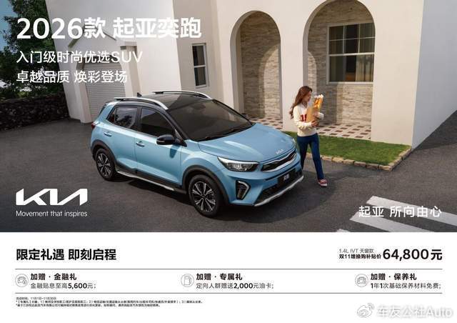 卓越品質,煥彩登場。11月1日,全球高品質SUV——2026款起亞煥新上市,新車新增了天霜藍外觀配色和灰色內飾配色,共推出2款車型,其中1.4L IVT天窗款雙11增換購補貼價僅64,800元。同時,購車用戶還可享金融貼息至高5,600元、定向人群贈送2,000元油卡、1年1次基礎保養材料免費等多項超值權益。