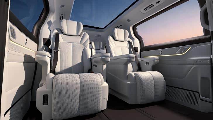 舒適配置方面,6座與8座版三排座椅支持180°一鍵躺平,7座版三排靠背最大可調角度137°;全車座椅配備通風、加熱功能,主副駕及二排支持8點按摩,搭配0壓腿托與睡眠頭枕;座椅采用11層結構設計,內置慢回彈記憶海綿。車內搭載17.3英寸防夾吸頂屏,配備9.1L冷暖冰箱,支持-6℃至50℃溫域調節與24小時遠程保溫;搭載27揚聲器Flyme Sound音響系統,形成9.1.6沉浸式聲場;配備5㎡全車透光面積與2.18㎡全景天幕,三排舷窗面積較同級高出70%。