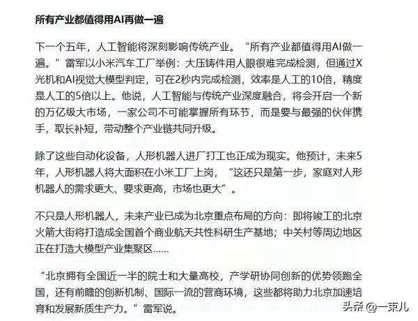 從制造業的效率革命到消費端的體驗升級,從工業機器人到家庭智能設備,AI正在重構每一個產業的核心邏輯。雷軍與小米的實踐證明,AI不是錦上添花的工具,而是重塑產業競爭力的核心引擎。下一個五年,隨著芯片算力的提升、大模型的普及、場景數據的積累,AI將從互聯網、消費電子等領域,全面滲透到新能源、新材料、醫療健康等傳統產業,讓“智能化”成為所有行業的標配。