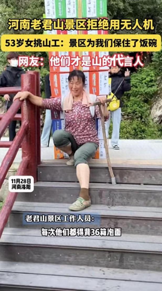“不是機器不好,是它會搶了我們的活路。”53歲的雷玉琴背著100斤物資,在老君山60度陡坡的石階上每走36步就歇一次腳,磨得發亮的扁擔壓彎了她的脊背,卻撐起了全家的生計。11月28日,老君山景區明確拒絕用無人機替代挑山工的決定,瞬間引發全網熱議:有人贊其“人情味拉滿”,有人斥其“守舊反智”,而挑山工們的真實心聲,卻道破了這場科技與人性之爭的核心——效率之外,更該有人的溫度。