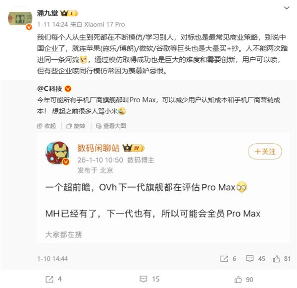 對此,小米產業投資部合伙人潘九堂在社交平臺發表了自己的看法,他指出,模仿/學習別人是人類從出生到死亡始終在進行的行為,在商業世界中,對標更是常見的策略。