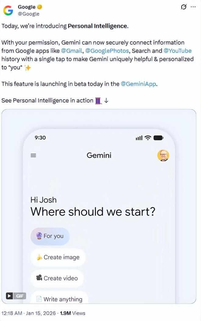 最關鍵的是底層新構建的 Personal Intelligence 引擎——這是一個全新的中間件,負責連接模型與用戶的私有數據源,包括 Gmail、Google Photos、YouTube 和搜索歷史等。