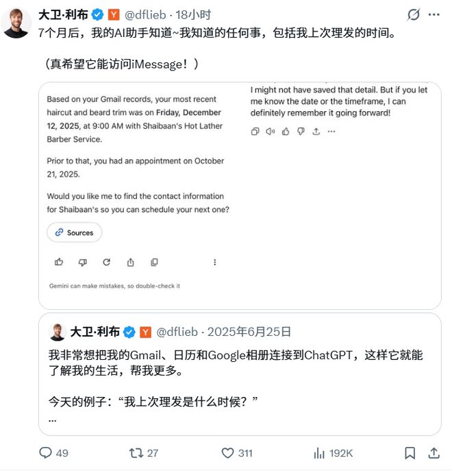 此外,Google Photos 創始人 David Lieb 也在社交媒體上展示了 Gemini 如何根據 Gmail 記錄幫他記得上次理發的時間,并且還會進一步提問他是否需要進行預約。
